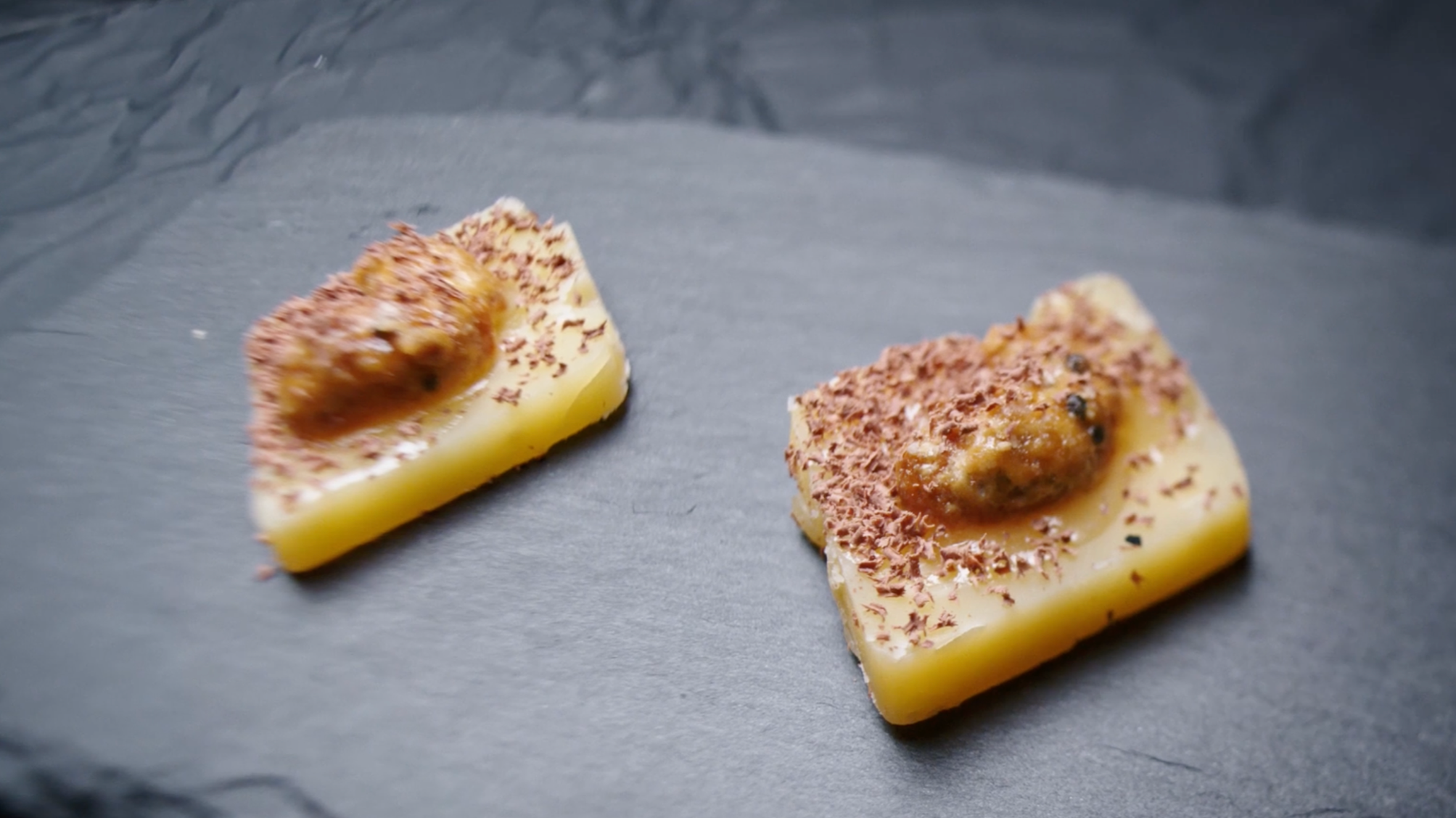 Toffee and boozy tones from this cheese inspire this pairing where some spice and maple tones cut the richness of the cheese while cashews and bourbon chocolate add complexity to the overall sweetness